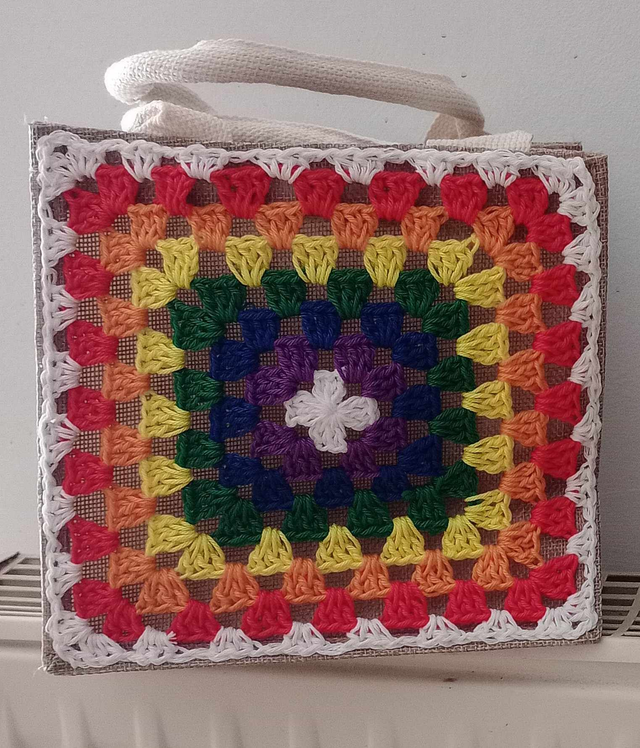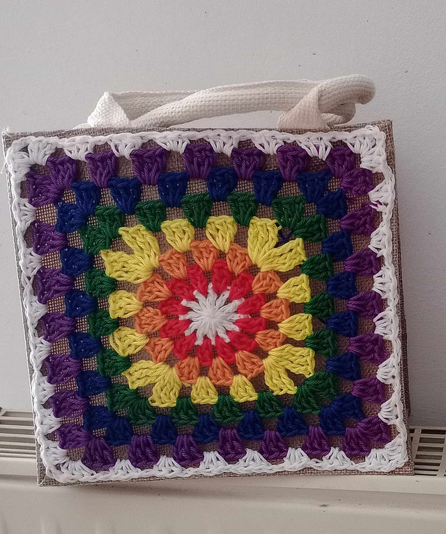 Sac en toile de jute agrémenté d'un motif fait au crochet